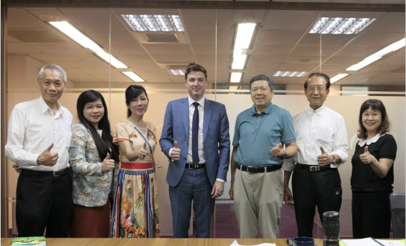 新加坡商台北碳權交易所董事長葉明水(右四)、總經理黃壽佐(左一)、董事王嘉男(右三)等人,偕同鼎宸碳資產管理股份有限公司執行董事徐品淳(左三)、董事楊宗斌(右一)及總經理鄭家茵(左二),與FLS總監 Arthur Bagnaud(左四)達成碳權開發戰略合作共識,未來將在全球推動「育林減碳計畫」。